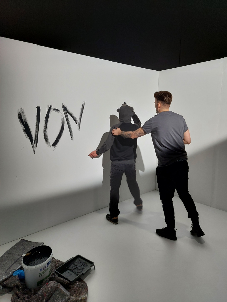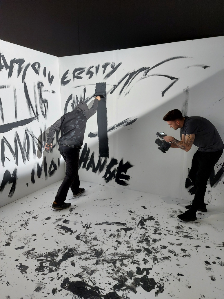 After that Kai did some shots with Peter where he put the lyrics on the wall with different paint brushes and thick black color.