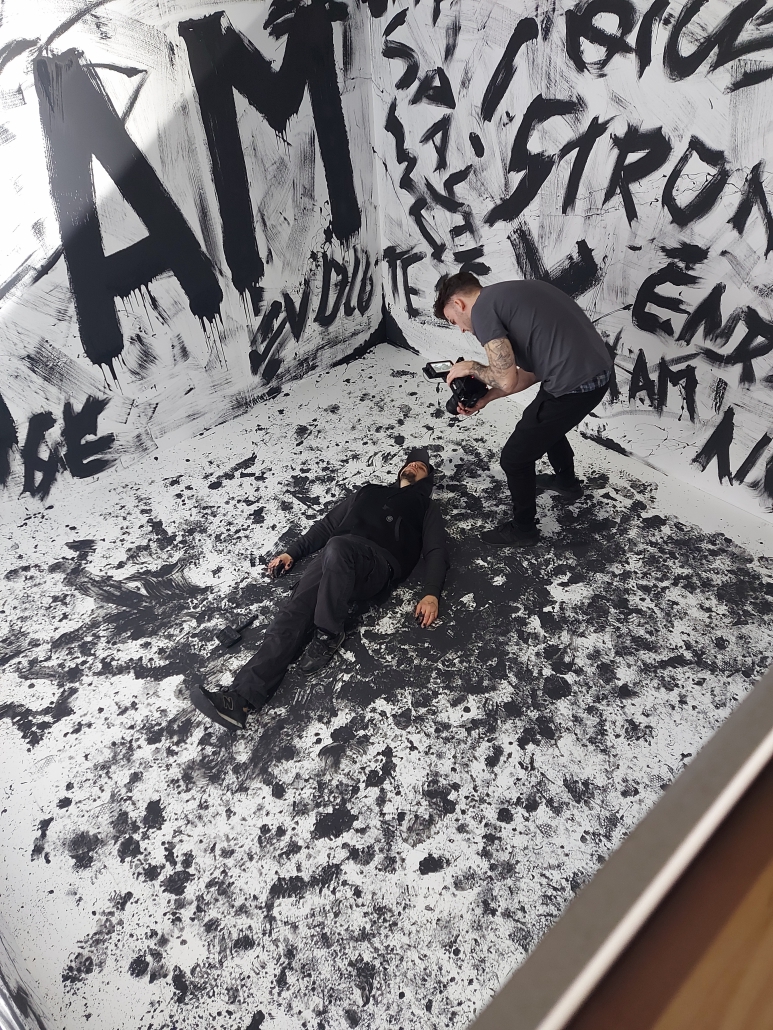 The story shots took about four hours to shoot, because we had to stop at some point a couple of times and fill the walls with more lyrics and then continued, otherwise Kai would be still standing in the room, painting the walls, haha.